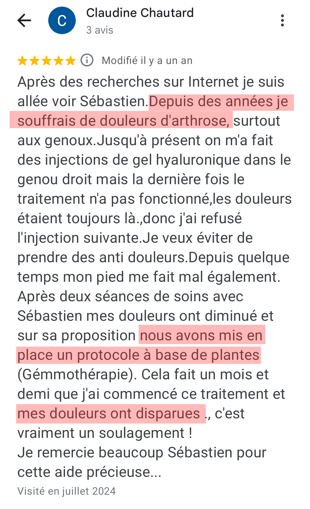 Au fil de ma pratique, j’ai rencontré de nombreuses personnes souffrant d’arthrose – parfois désabusées après avoir tout tenté. C’est ce qui m’a poussé à me passionner pour les approches naturelles de l’arthrose et à développer un protocole global combinant soins manuels, mobilité douce et soutien naturel.